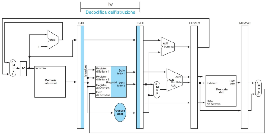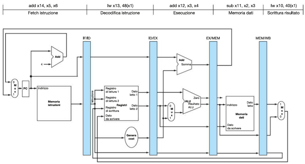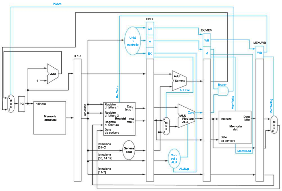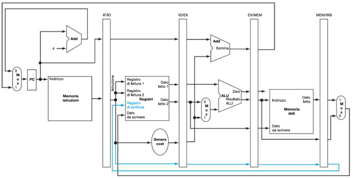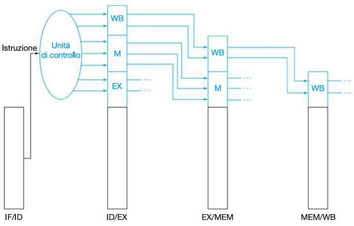 Quindi, come per le istruzioni, anche i segnali vengono mano a mano registrati nei registri tra stadi (ID/EX, EX/MEM, MEM/WB), in modo da essere propagati da ID al loro stadio di appartenenza: |
