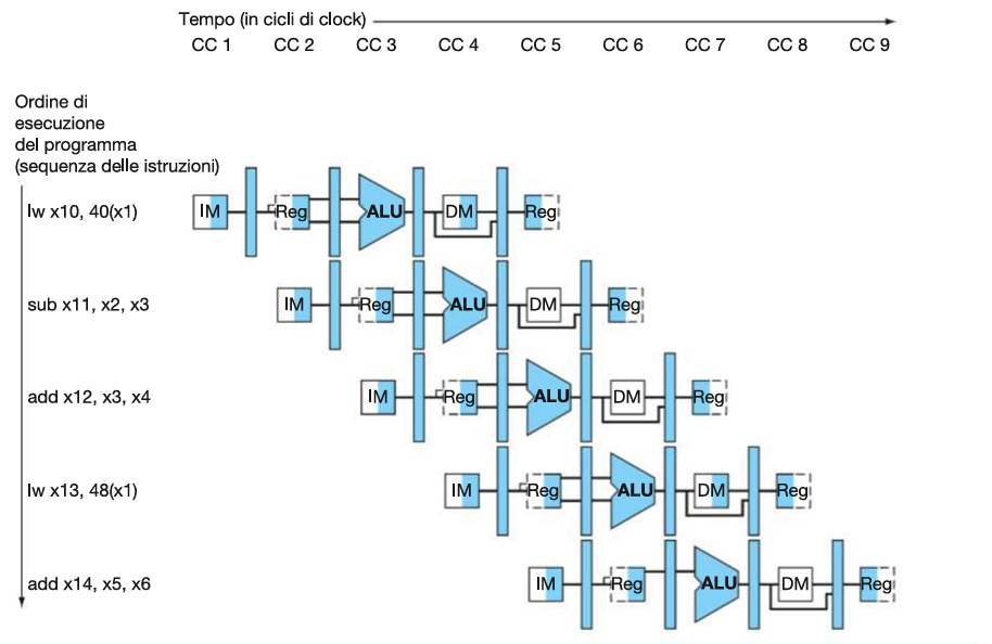 add x14, x5, x6Ci sono due modi di rappresentare l’esecuzione di questo programma con pipeline: