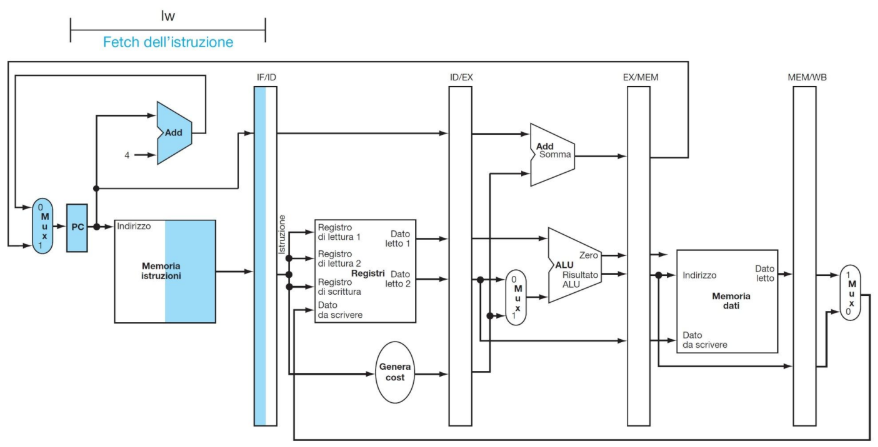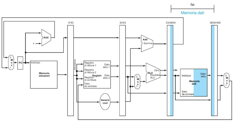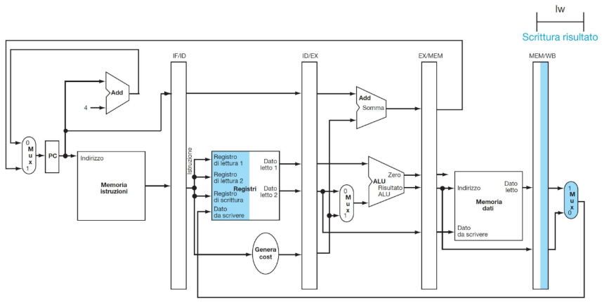 - MEM/WB: (64 bit) Trasporta i dati letti dalla memoria e i risultati finali verso lo stadio di scrittura (Write Back).