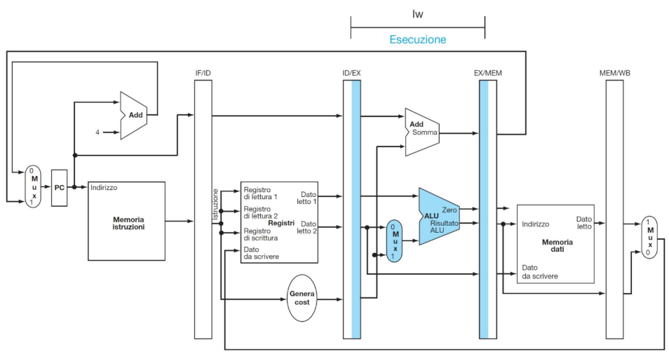 - ID/EX: (128 bit) Memorizza i dati letti dai registri, i segnali di controllo e l’istruzione decodificata.
