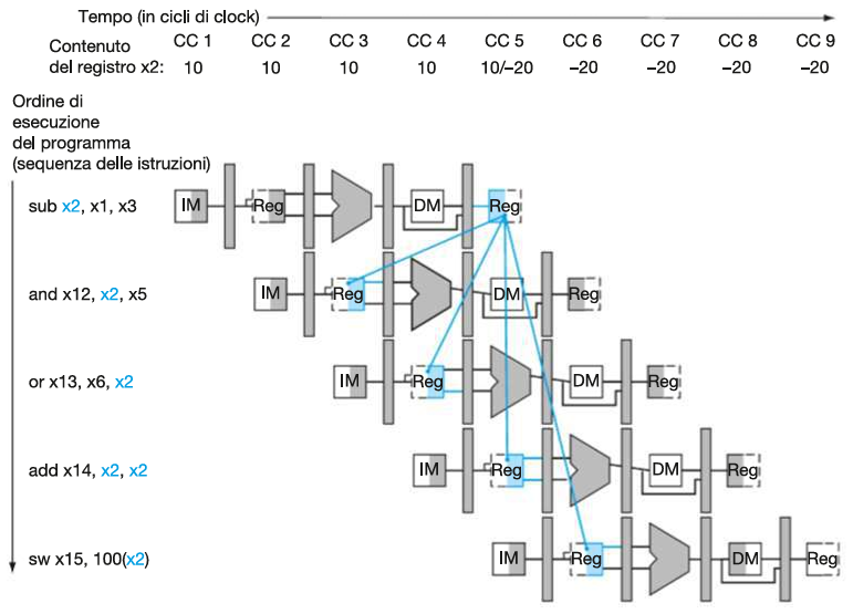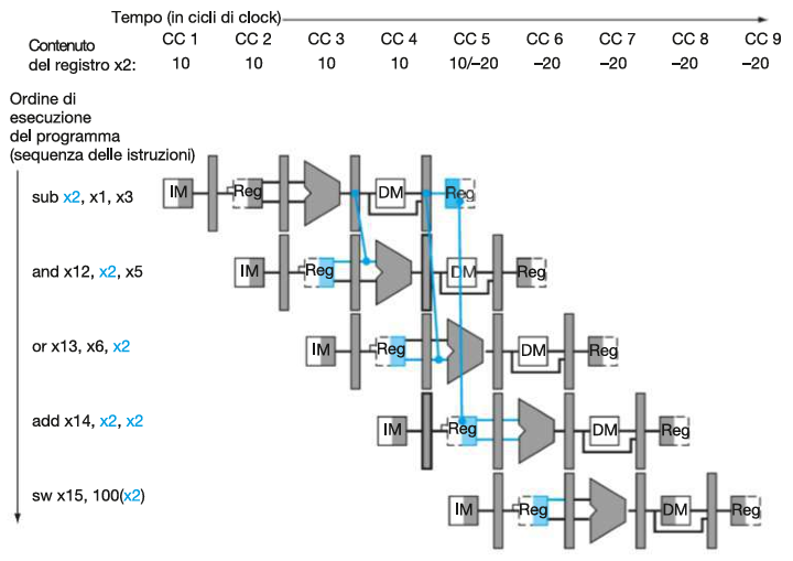 sub x2, x1, x3⟶and x12, x2, x5: 1.a hazard (legge ancora 10).sub x2, x1, x3⟶or x13, x6, x2: 2.b hazard (legge ancora 10).sub x2, x1, x3⟶add x14, x2, x2: NO hazard (legge -20).sub x2, x1, x3⟶sw x15,100(x2): NO hazard (legge -20).