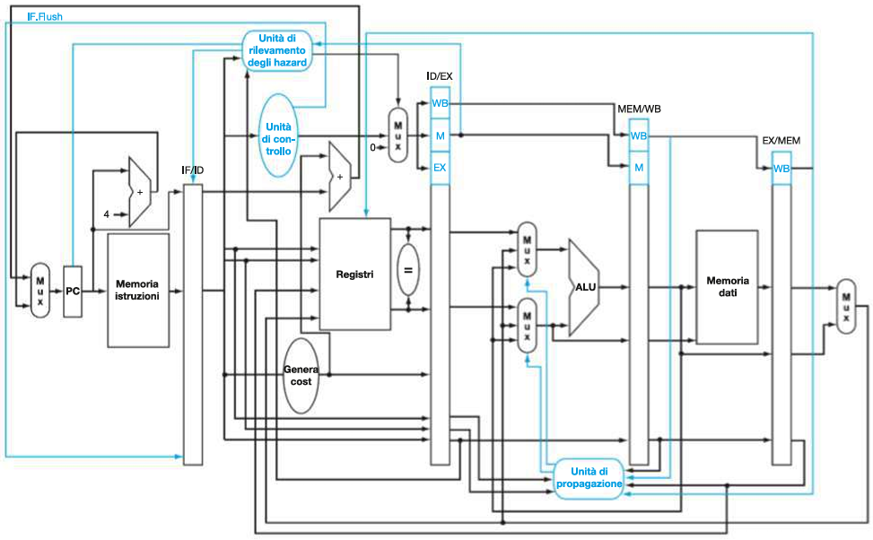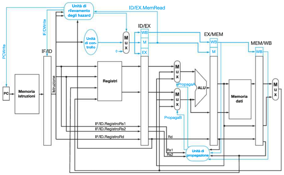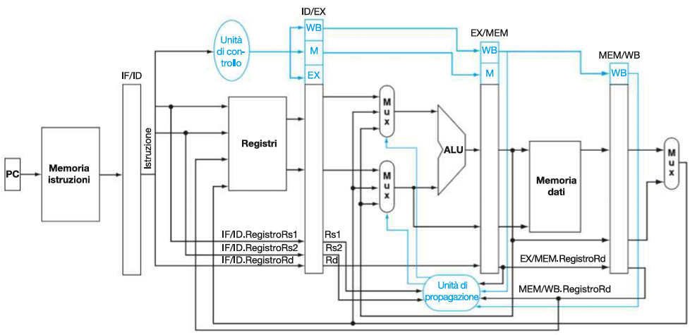 Due Mux (multiplexer) sui due input dell’ALU (A e B) e una Forwarding Unit (unità di controllo propagazione).