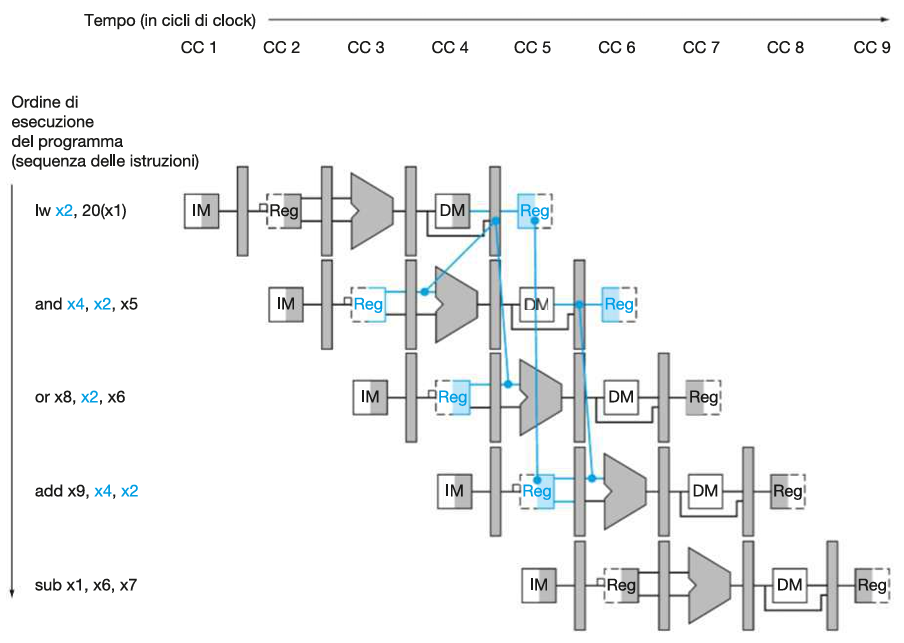 Una volta identificati i data hazard nei vari casi procediamo a bypassarli con la tecnica del forwarding: