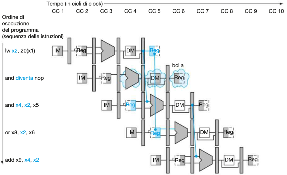 and x4, x2, x5*In un sistema con hazard detection unit, (come RISC-V) non serve scriverlo: l’hardware inietta automaticamente la bolla quando rileva un hazard load-use.