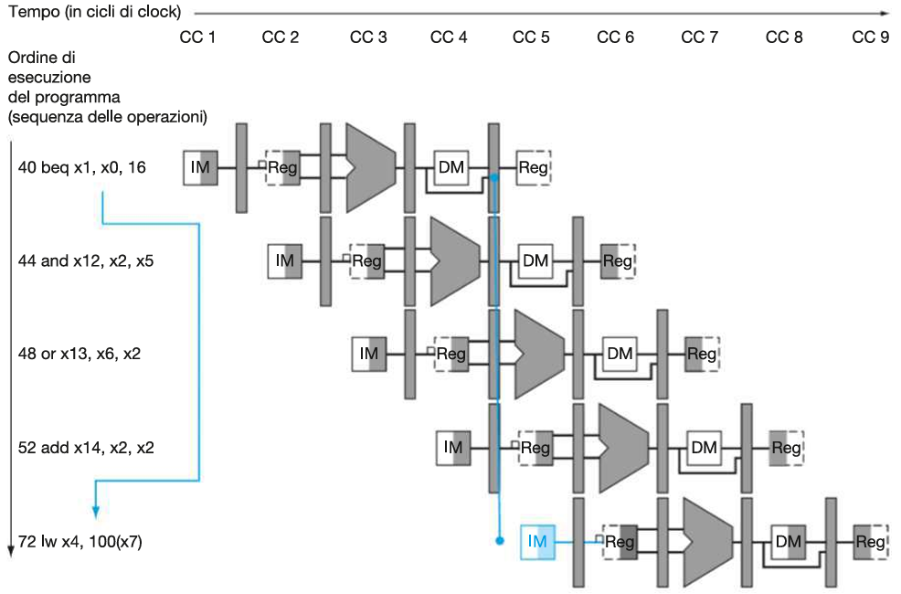 beq x1, x0, 16⟶and x12, x2, x5: control hazard (fetch prima del controllo).beq x1, x0, 16⟶or x13, x6, x2: control hazard (fetch prima del controllo).beq x1, x0, 16⟶add x14, x2, x2: control hazard (fetch prima del controllo).