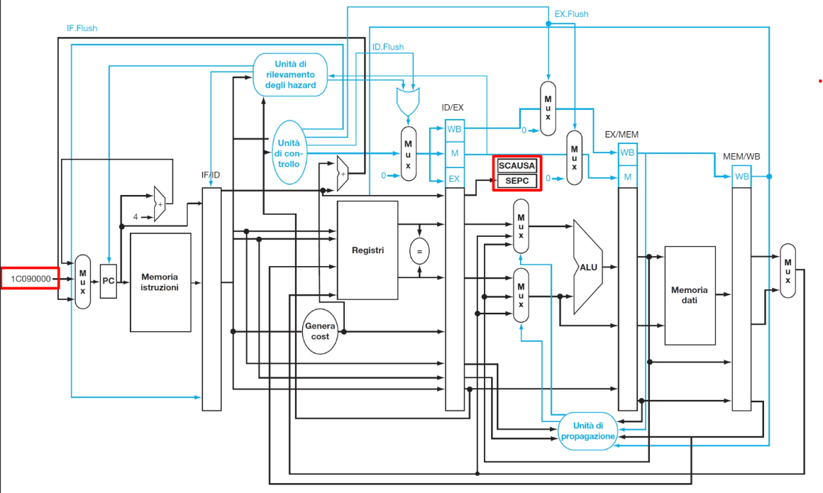 Un ingresso al MUX che seleziona l’indirizzo di salto per gestire l’eccezione/interruzione (ad esempio, l’indirizzo della routine di servizio degli interrupt, indirizzo 1C090000).