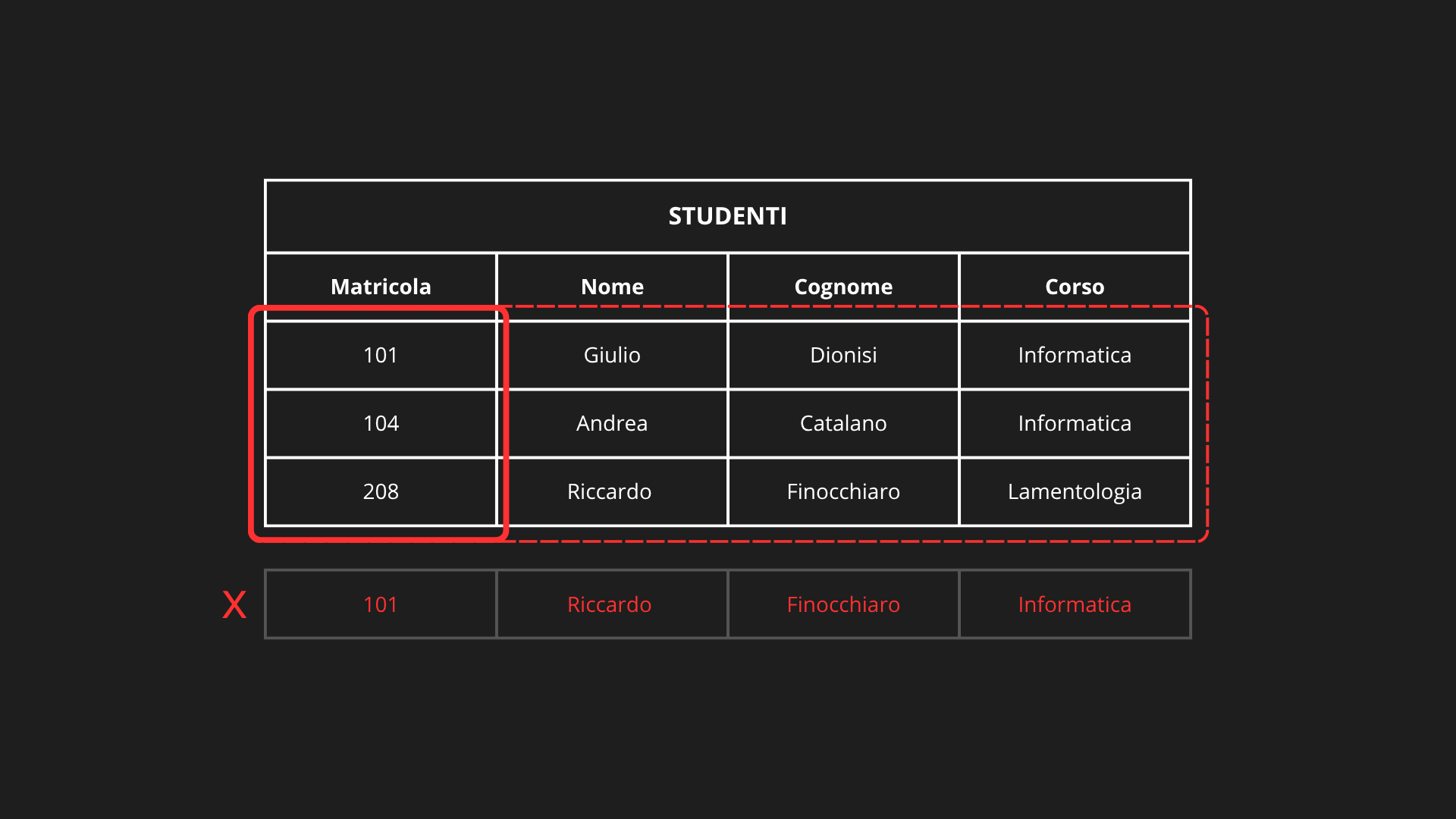 Condizione logica: soddisfatta in quanto non esistono due o più tuple con stessa Matricola e Nome, Cognome, Corso diversi, ad esempio: dove Matricola = 101, i valori di Nome, Cognome e Corso coincidono in tutte le tuple (Giulio, Dionisi, Informatica). Non varrebbe se comparisse una tupla (101, Riccardo, Finocchiaro, Informatica): stessa Matricola, ma Nome e Cognome diversi, dunque è una violazione.