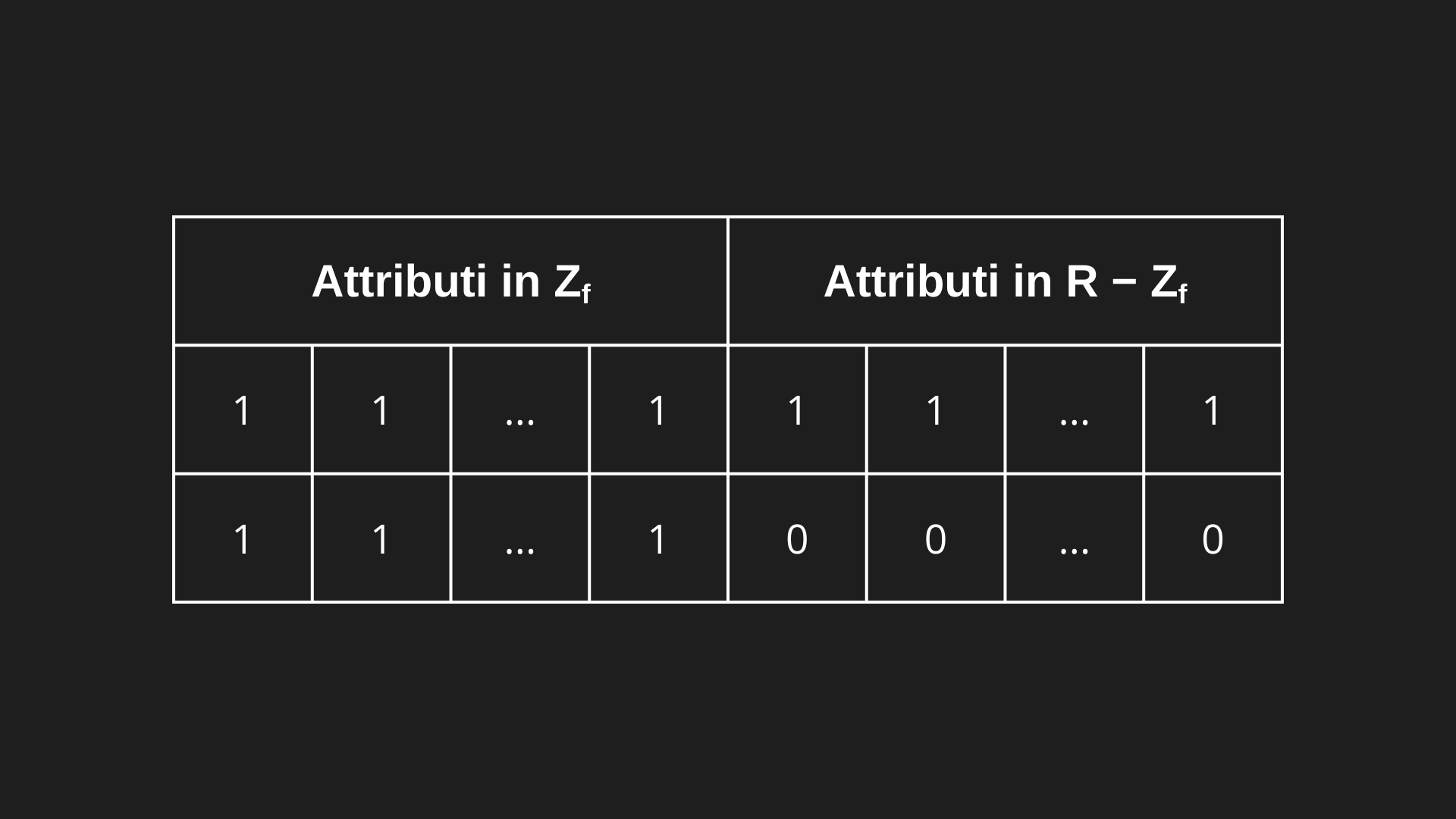 Questo (data la costruzione di r) è possibile solo se A ∈ Zf, in quanto se A ∈ R - Zf avremmo t1[A] ≠ t2[A] e X → A ∈ F+ non sarebbe soddisfatta. Quindi A ∈ X+ ⇒ A ∈ Zf è dimostrato.