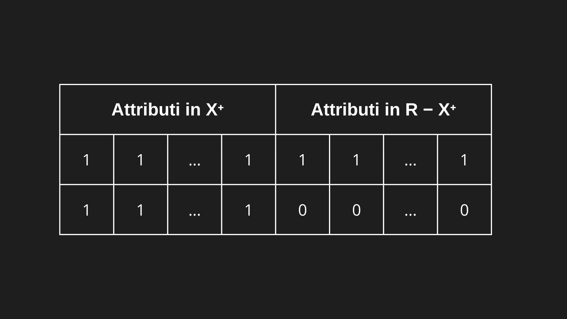 - Se una dipendenza ha il determinante (parte sinistra) tutto dentro X+, allora le due tuple avranno gli stessi valori su quella parte.