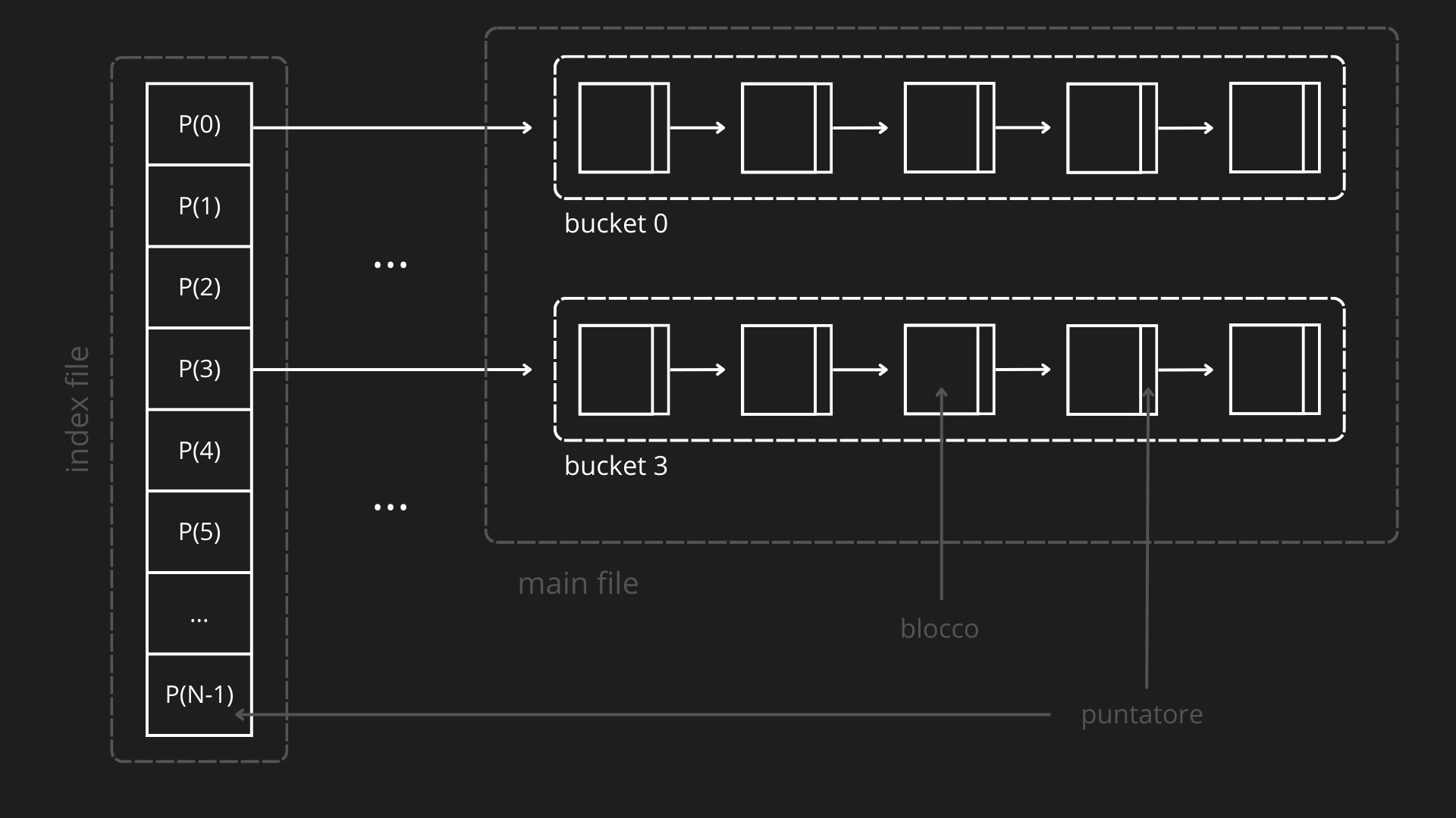 - Un file indice (o bucket directory), che contiene una tabella hash con puntatori ai bucket del file principale