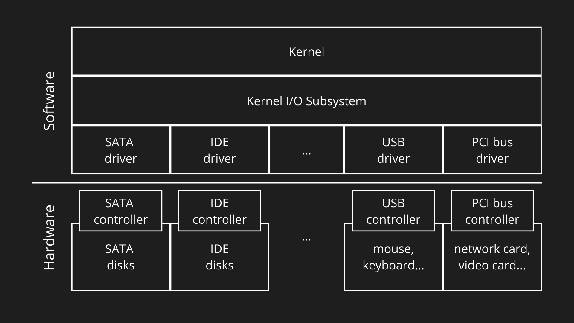 - Il dispositivo fisico è la periferica vera e propria (ad esempio tastiera, disco, stampante, interfaccia di rete). Questo dispositivo non comunica direttamente con la CPU, ma è gestito da un device controller, un componente hardware che funge da intermediario.
