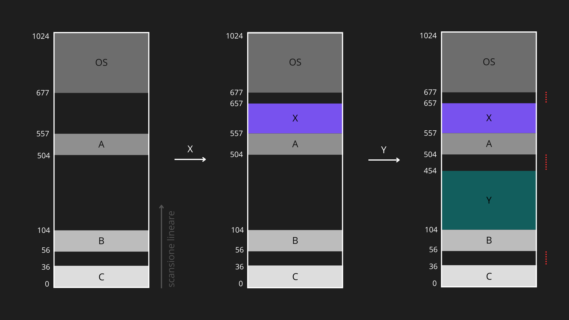 - Se successivamente il processo Y richiede 350 byte, il sistema operativo lo alloca nel buco da 400 byte, creando un nuovo buco residuo di 50 byte.