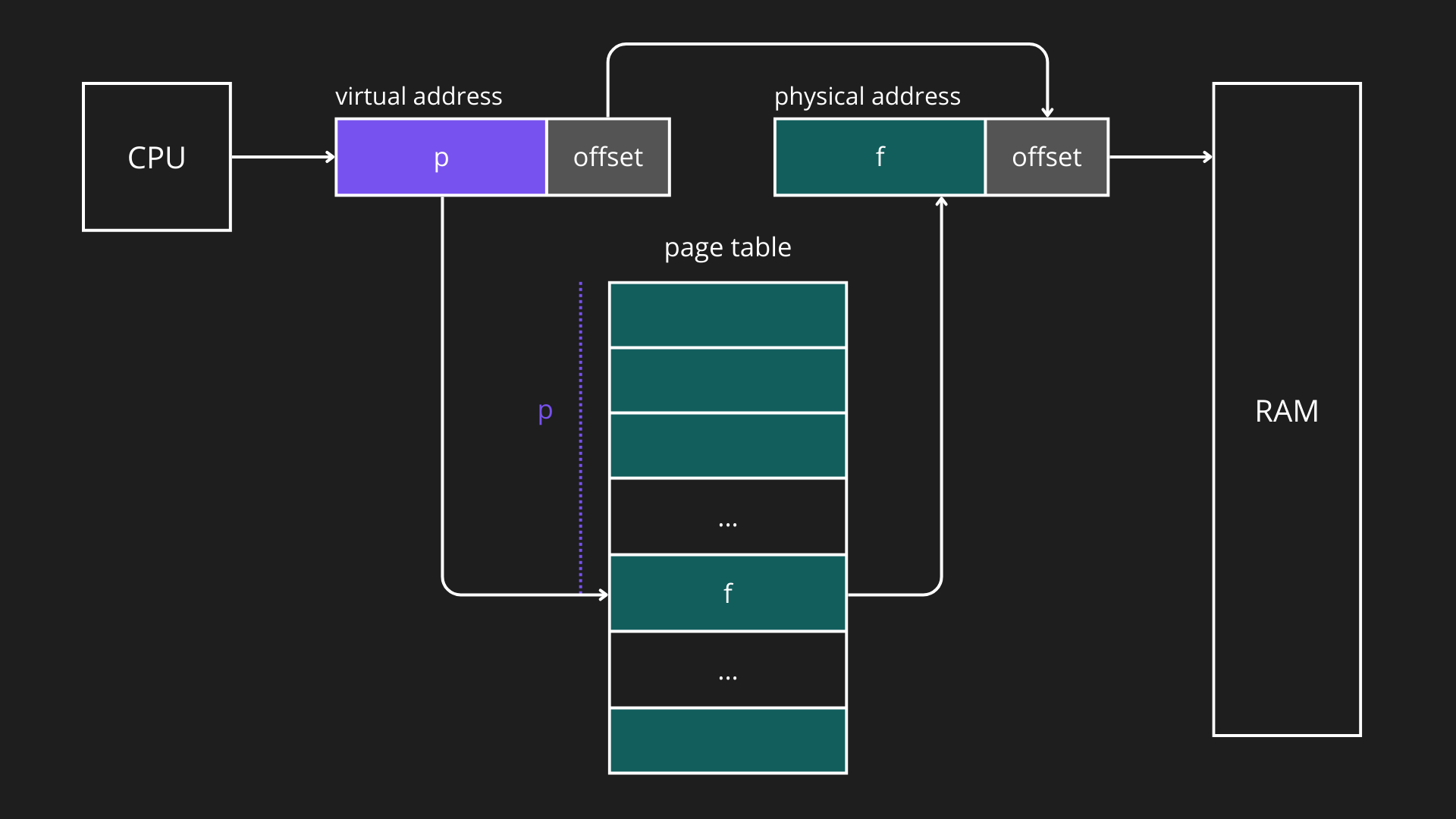 La corrispondenza tra pagine logiche e frame fisici è mantenuta dal sistema operativo tramite una tabella delle pagine (page table). Durante l’esecuzione, la CPU genera un indirizzo logico composto da numero di pagina virtuale (p) e offset. La MMU utilizza la page table per tradurre il numero di pagina nel frame fisico corretto, mantenendo invariato l’offset. Analogamente a quelli logici, ogni indirizzo fisico è costituito da un numero di frame (f) e da un offset relativo all’inizio del frame.