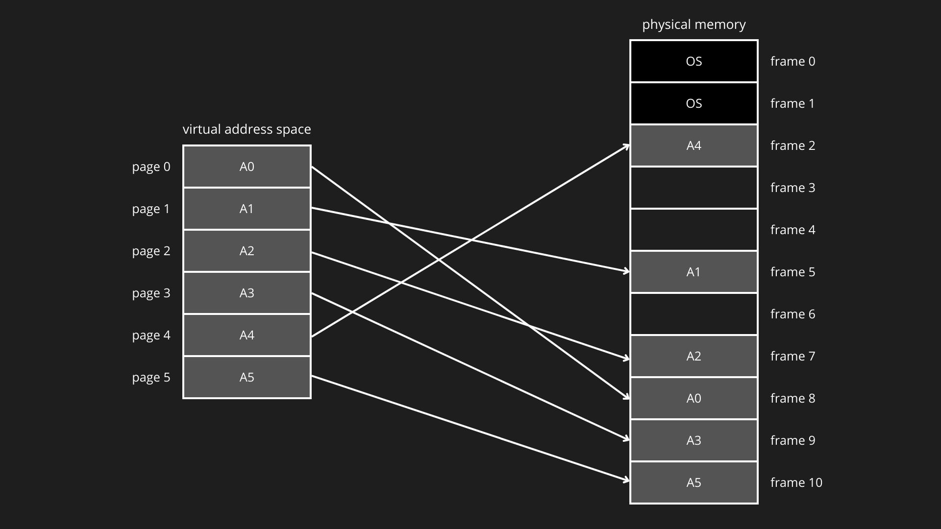 La paginazione è una tecnica di gestione della memoria che elimina la necessità di allocare spazio contiguo ai processi. La memoria logica (memoria virtuale) di un processo viene suddivisa in pagine (pages) di dimensione fissa, mentre la memoria fisica (RAM) è suddivisa in frame della stessa dimensione. Ogni pagina può essere collocata in un qualunque frame libero della memoria fisica. Prendendo per esempio la mappatura di un processo A: