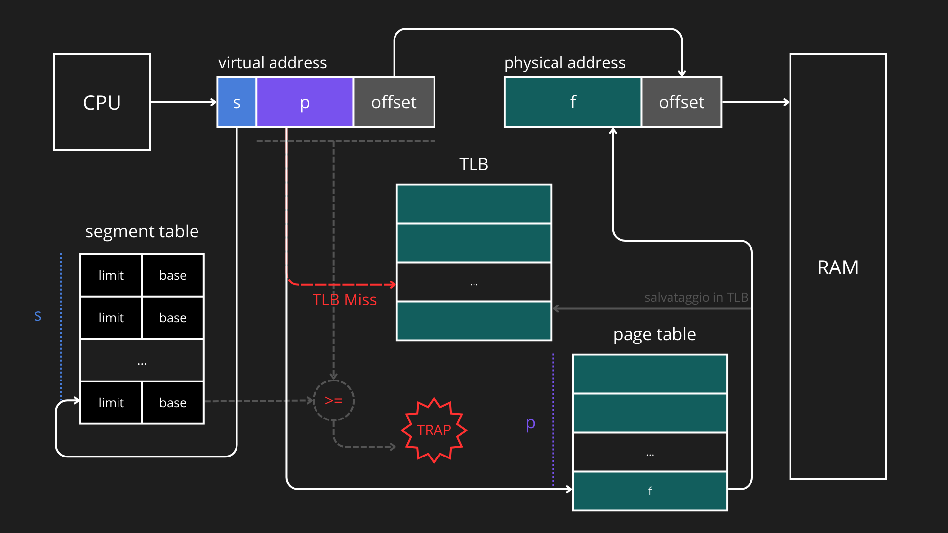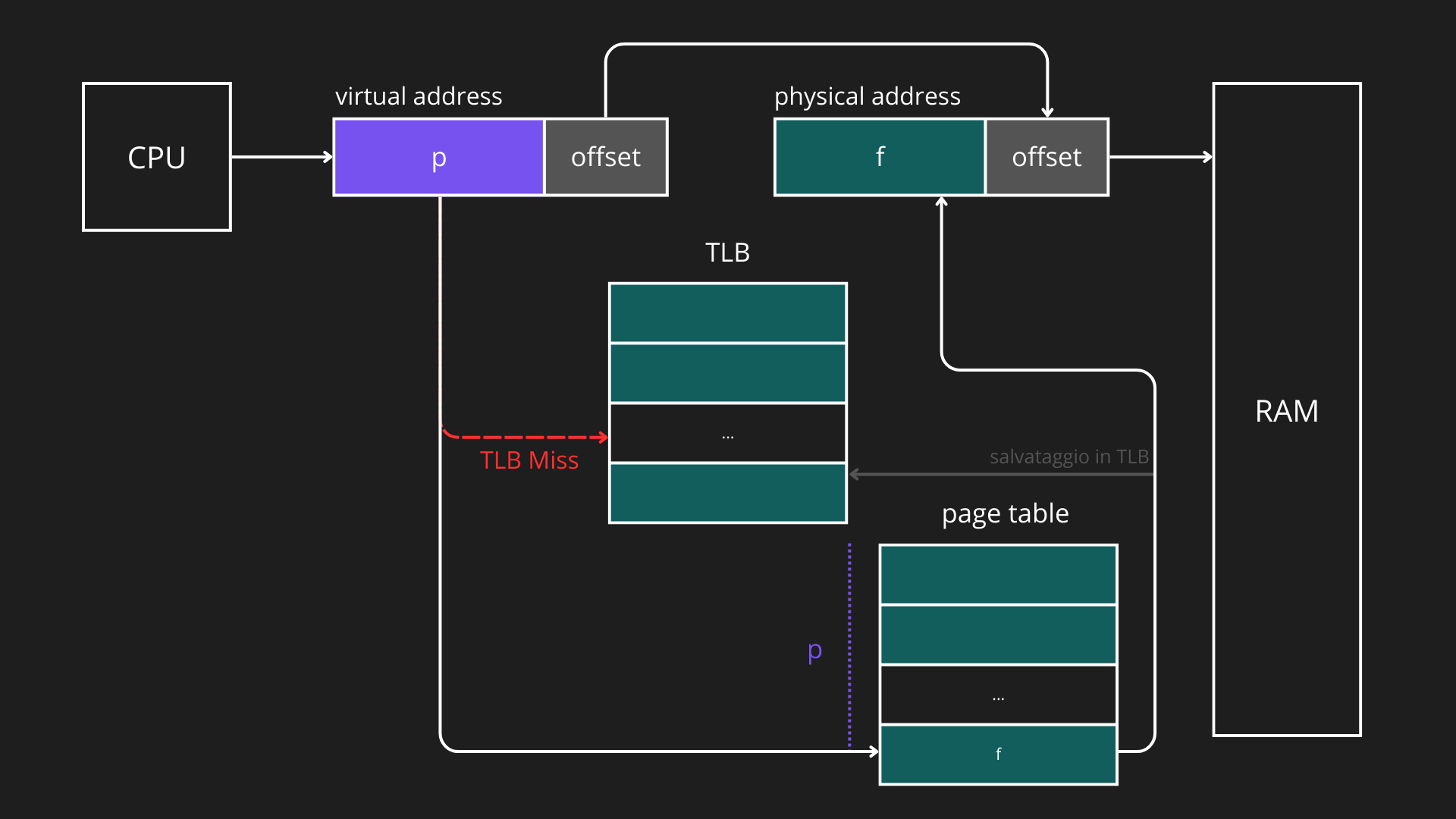 - TLB miss: la traduzione viene cercata nella page table, e la corrispondente entry viene caricata nella TLB per future traduzioni.