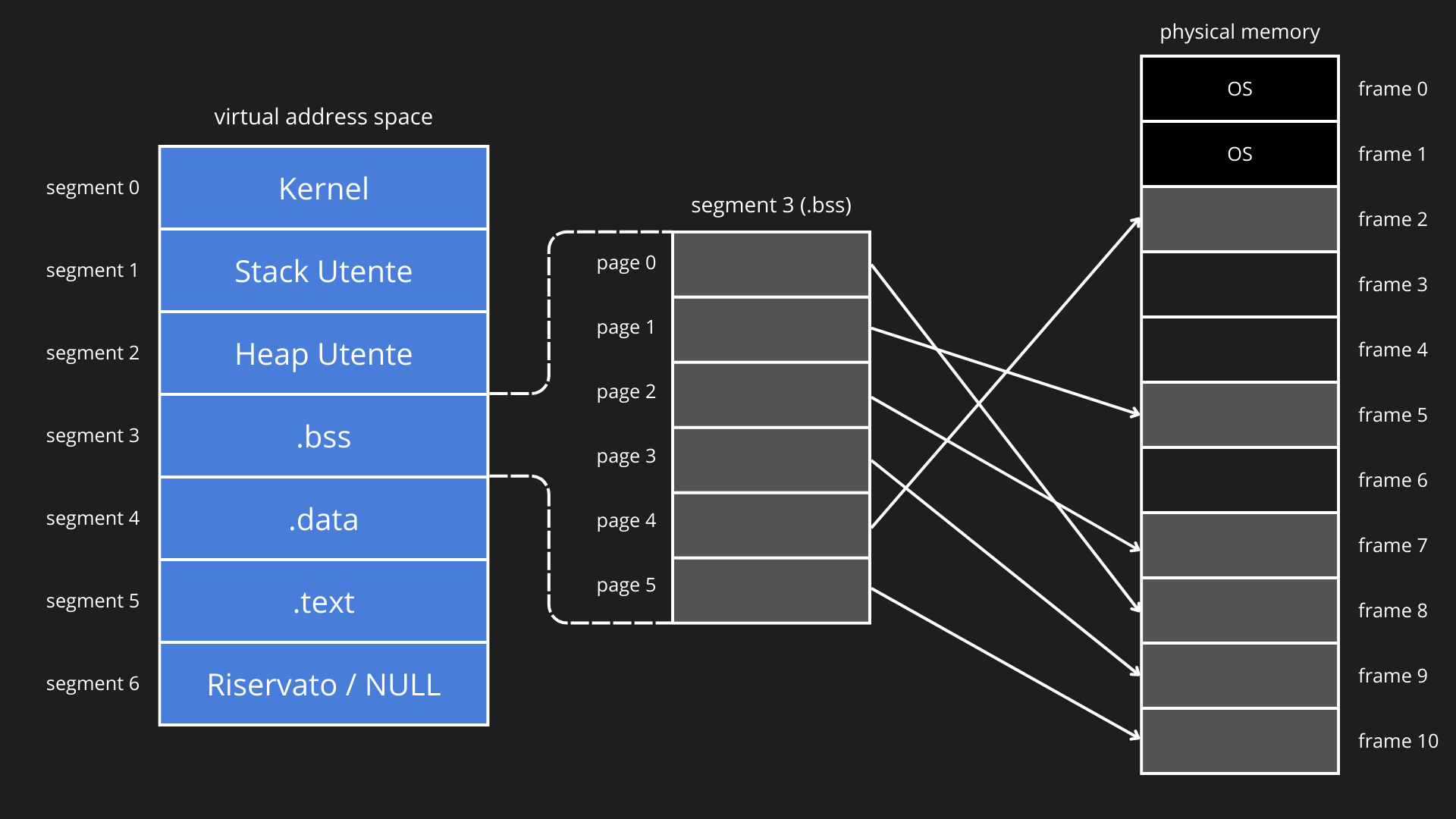 L’indice del segmento in memoria virtuale viene utilizzato per leggere la segment table: Se il segmento è valido, il numero di pagina viene usato per accedere alla page table del segmento. La page table dunque mappa la pagina virtuale sul frame fisico corrispondente in RAM e l’offset viene aggiunto al frame fisico per ottenere l’indirizzo fisico finale. Se il segmento o la pagina non sono presenti in RAM, si genera una trap: il sistema operativo deve caricare la pagina dal disco (backing store) o gestire errori di protezione.