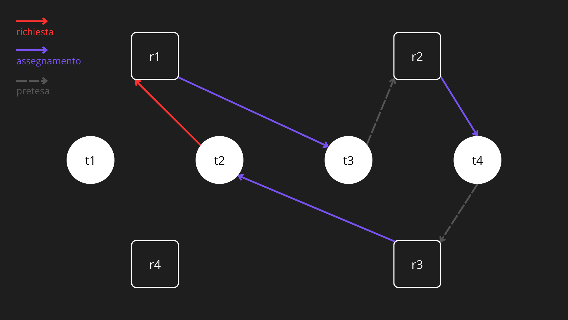 - A questo punto, il thread t3, possedente la risorsa r1, richiede la risorsa r2, rimanendo in attesa che essa sia liberata dal thread t4.