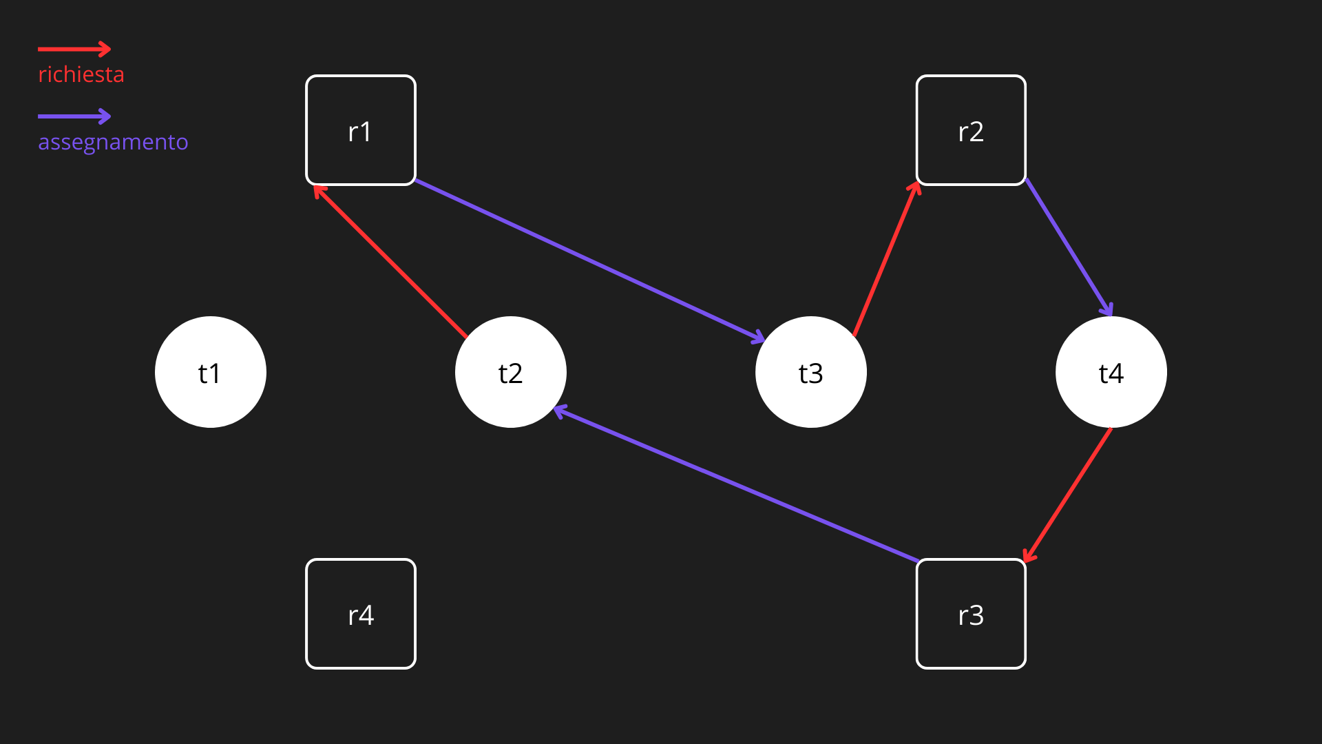 - A sua volta, il thread t4, possedente la risorsa r2, richiede la risorsa r3, rimanendo in attesa che essa sia liberata dal thread t2.